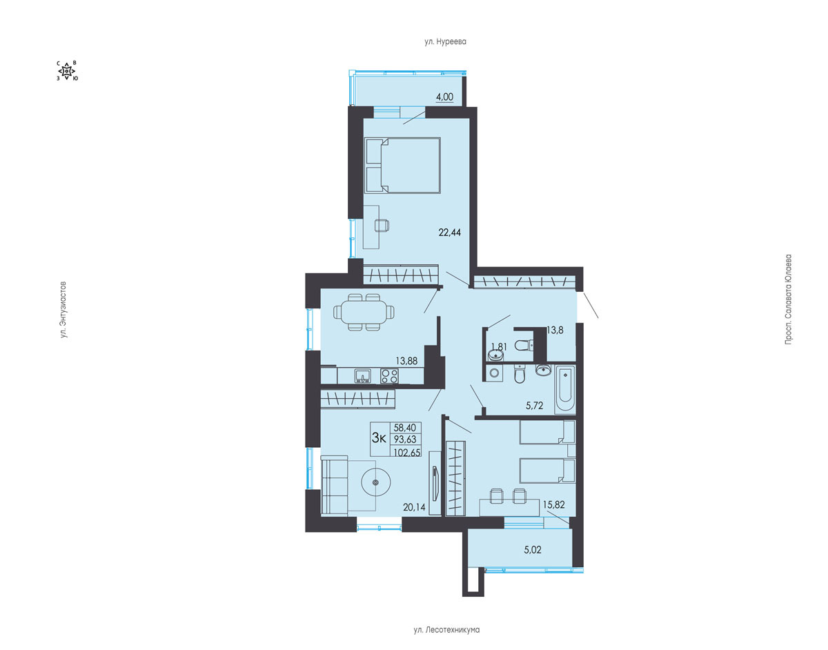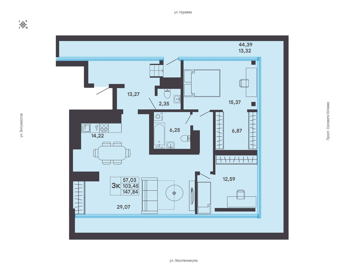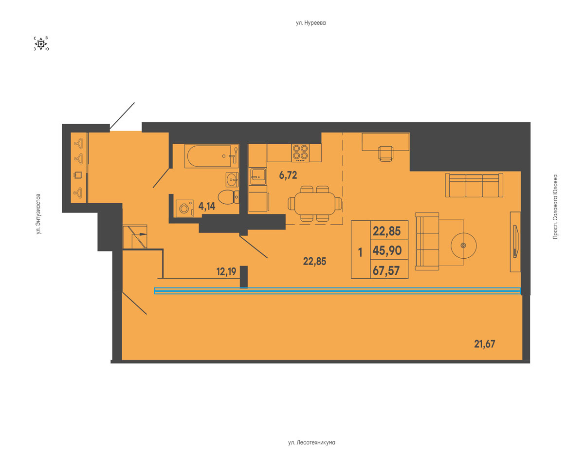 Квартал Энтузиастов — это 6 жилых домов переменной этажности в 8 — 25 этажей. С верхних этажей открывается красивый панорамный вид на город и реку Уфа.